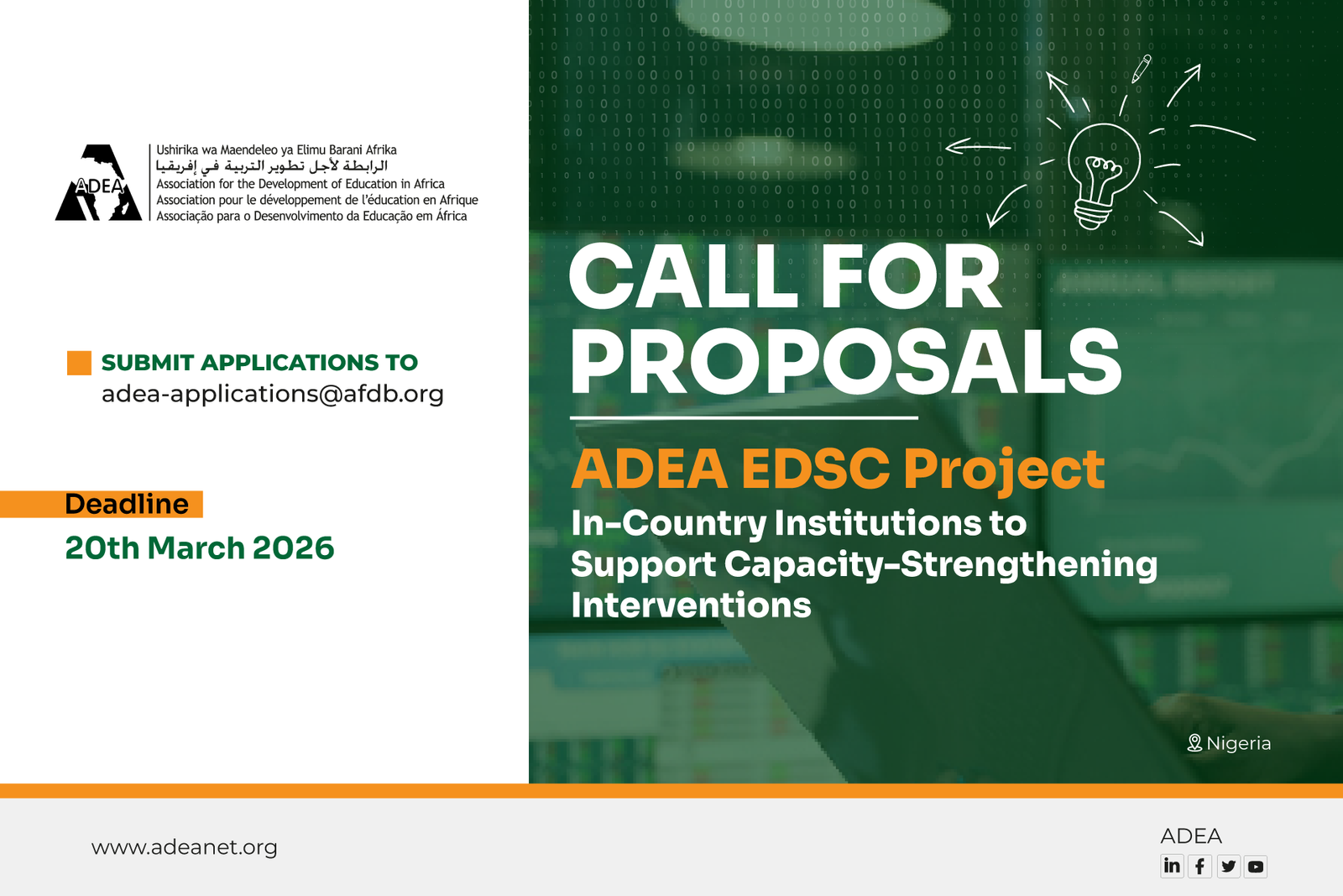Applications must be sent to adea-applications@afdb.org no later than 20 March 2026 at midnight GMT. The subject of the e-mail should be “ADEA ESDC Project in Nigeria: In-Country Institution”.