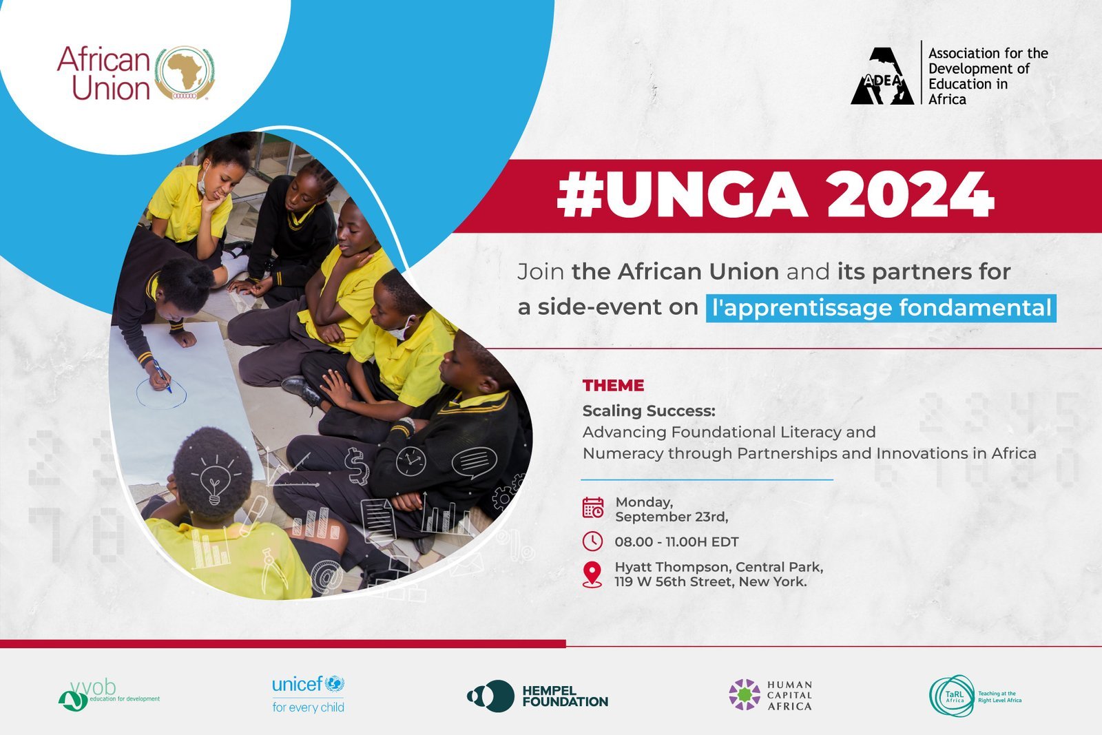 The African Union and ADEA, in partnership with foundational learning stakeholders, VvoB, TaRL Africa, Hempel Foundation, UNICEF, and Human Capital Africa, will hold a side event on foundational learning on the margins of UNGA. The event’s theme is ‘Scaling Success: Advancing Foundational Literacy and Numeracy through Partnerships and Innovation in Africa.’ The event will help raise the salience of foundational learning, showcase its bright spots, share lessons, call for increased investments, and exchange with stakeholders on how Africa can accelerate reforms that will reverse learning poverty.