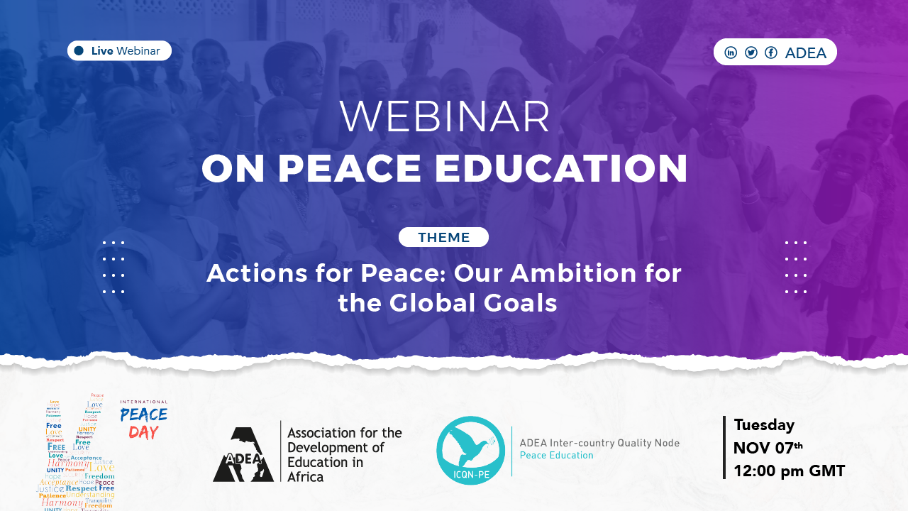 The Association for the Development of Education (ADEA), through its Inter-Country Quality Node on Peace Education (ICQN-PE), is organising a webinar on Peace Education which will be held on the 7th November 2023 from 12:00pm to 2:00pm GMT.