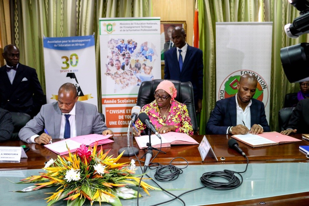 La cérémonie de signature a eu lieu dans les locaux du ministère en présence de S.E. Mme Kandia K. Camara, Ministre de l’Education nationale, de l’Enseignement technique et de la Formation professionnelle ; de M. Didier Drogba, Président de la Fondation Didier Drogba ; de M. Albert Nsengiyumva, Secrétaire exécutif de l’ADEA ; de M. Yaya Toure, manager de BYTE sarl ainsi que de hauts fonctionnaires du ministère, des représentants de l’ADEA, de la FDD et des médias.