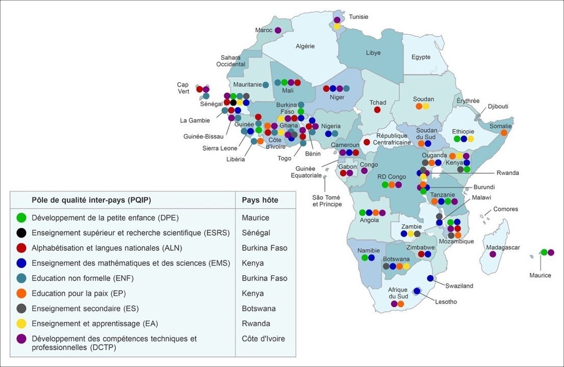 [1] Pôles de qualité inter-pays de l’ADEA: 1) Alphabétisation et langues nationales (PQIP-ANL) au Burkina Faso; Développement des compétences techniques et professionnelles (PQIP-DCTP) en Côte d’Ivoire; Développement de la petite enfance (PQIP-DPE) au Maurice; Enseignement et apprentissage (PQIP-EA) au Rwanda; Enseignement des mathématiques et des sciences (PQIP-MSE) au Kenya; Éducation non formelle (PQIP-ENF) au Burkina Faso; Éducation pour la paix (PQIP-EP) au Kenya; Enseignement secondaire (PQIP-ES, lancement prévu en 2020 au Botswana); Enseignement supérieur et recherche scientifique (PQIP-ESRS) au Sénégal.