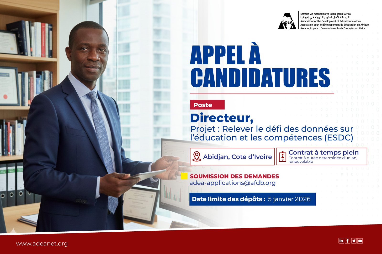 Les candidatures doivent être envoyées à adea-applications@afdb.org au plus tard le lundi 5 janvier 2026 à minuit GMT. L'objet de l'e-mail doit être: « Directeur – Initiative sur le défi des données sur l'éducation et les compétences (ESDC) ».