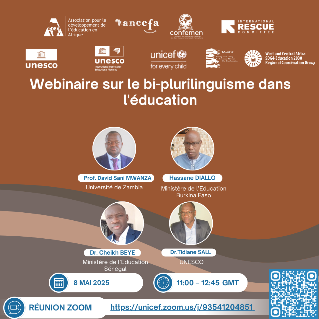 Ce webinaire présentera les résultats et les recommandations d'une étude de recherche multi-pays sur le multilinguisme et le bi/plurilinguisme dans les écoles du Sahel central (Mali, Burkina Faso, Niger) ; deux pays (Burkina Faso et Sénégal) partageront leur processus national et les efforts actuels pour développer les programmes d'éducation bi/plurilingue ; et une table ronde permettra d’entendre les recommandations des experts dans le domaine.