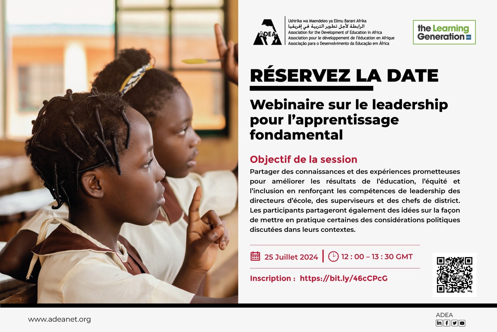The Learning Generation Initiative (LGI) et l’Association pour le développement de l’éducation en Afrique (ADEA) ont le plaisir de vous inviter à un webinaire sur le leadership pour l’apprentissage fondamental, qui aura lieu le jeudi 25 juillet 2024 de 12h00 à 13h30 GMT (heure d’Abidjan), sur Zoom.