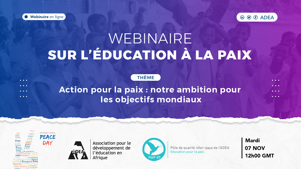 L'Association pour le développement de l'éducation (ADEA), à travers son Pôle de qualité inter-pays sur l'éducation pour la paix ( PICQ-EP), organise un webinaire sur l'éducation pour la paix qui se tiendra le 7 novembre 2023 de 12h00 à 14h00 GMT.