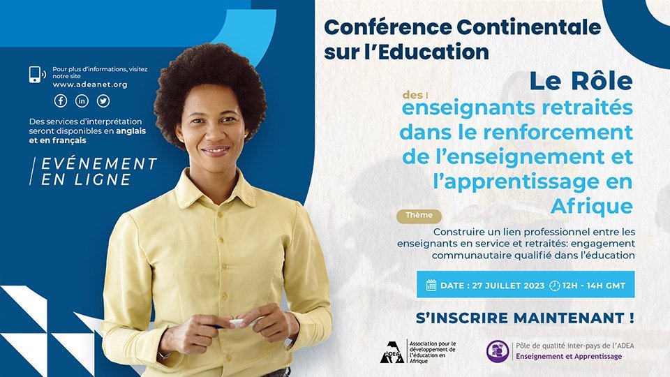Le pôle de qualité inter-pays de l'ADEA sur l'enseignement et l'apprentissage (PQIP-EA), hébergé par le Rwanda, organisera une conférence virtuelle pour discuter du rôle des enseignants retraités dans le renforcement de l'enseignement et de l'apprentissage en Afrique. L'événement aura lieu le 27 Juillet 2023 de 12h00 à 14h00.
