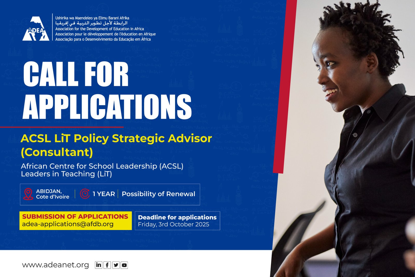 Interested candidates should submit a CV and cover letter outlining relevant experience and motivation adea-applications@afdb.org with the subject “ACSL LiT Policy Strategic Advisor (Consultant)”.