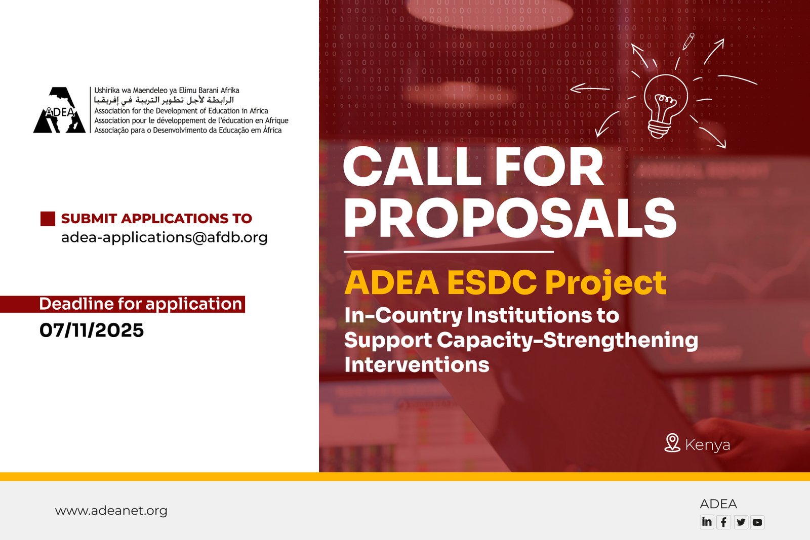 Applications must be sent to adea-applications@afdb.org no later than November 7, 2025, at midnight GMT. The subject of the e-mail should be “ADEA ESDC Project in Kenya”.