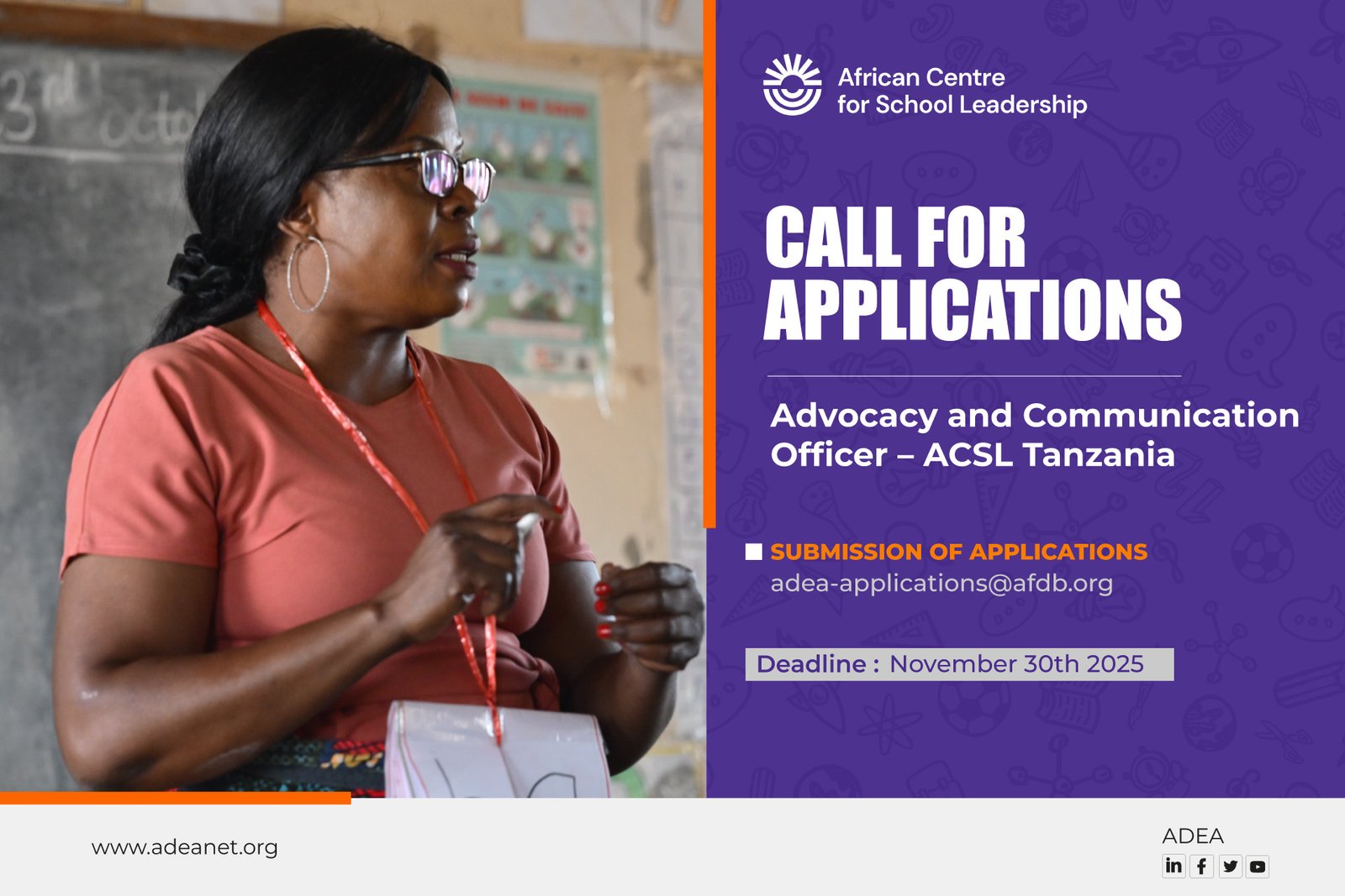 Interested candidates are invited to send their curriculum vitae, a letter of motivation and a portfolio of their work to adea-applications@afdb.org by November 30th, 2025 (12.00 AM, GMT). Please indicate “Advocacy and Communications Officer” in the subject line.