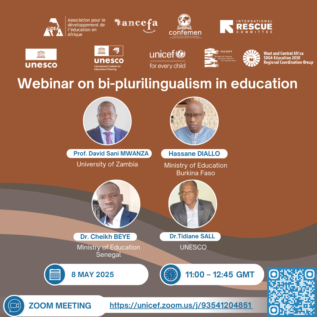 This webinar will present the findings and recommendations from a multi-country research study on multilingualism and bi/plurilingualism in schools in the central Sahel (Mali, Burkina Faso, Niger); have two countries (Burkina Faso and Senegal) share their country process and current efforts on scaling up bi/plurilingual education programmes; and will propose a panel discussion to hear recommendations for countries from experts in the field.