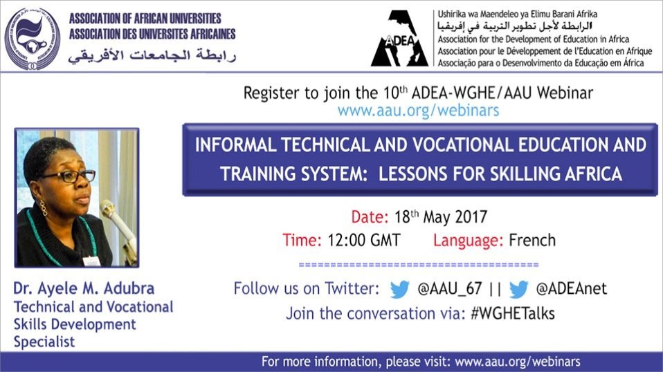 10th ADEA-WGHE/AAU Webinar: Informal Technical and Vocational Education and Training System: Lessons for Skilling Africa