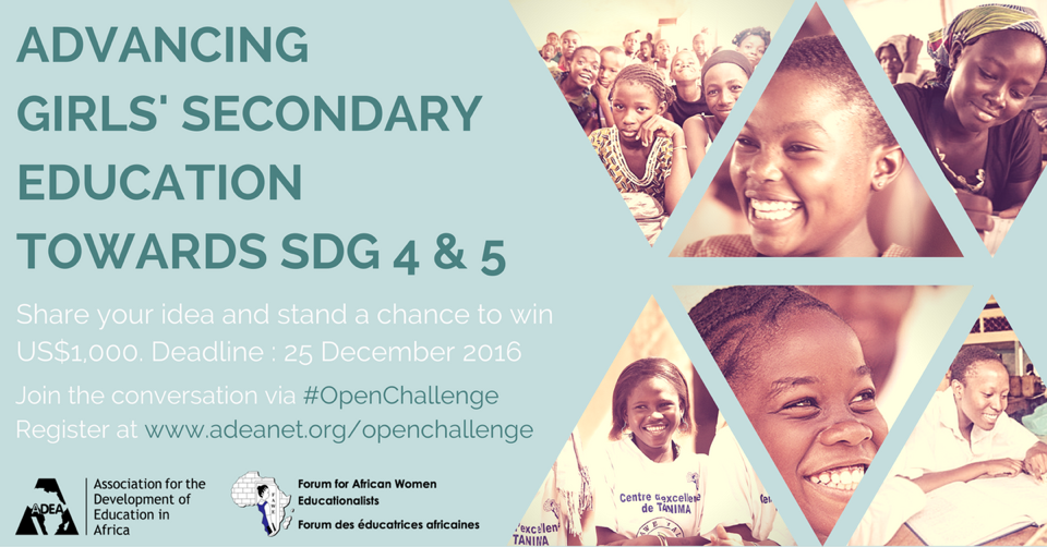 Abidjan, Harare, Nairobi - 25th October 2016. The Association for the Development of Education in Africa’s Working Group on Education Management and Policy Support (ADEA WGEMPS) and the Forum for African Women Educationalists (FAWE) are searching for ideas and scalable innovative programmes/projects/activities that can/have successfully advanced girls’ in secondary education in Africa. The challenge will run from 25th October to 25th December 2016. Submissions stand a chance to win a USD$1,000 cash prize.