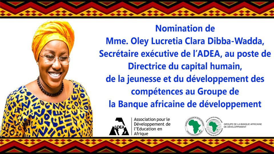 L'Association pour le développement de l'éducation en Afrique (ADEA) félicite chaleureusement Mme Oley Dibba-Wadda, secrétaire exécutive de l'ADEA, qui a été nommée directrice du Capital humain, de la jeunesse et du développement des compétences au sein du Groupe de la Banque africaine de développement. Nous remercions également Oley pour le leadership exceptionnel, la vision, le dévouement et l'engagement vers l'excellence qu'elle a apporté à l'Association. Nous sommes convaincus que Mme Dibba-Wadda continuera à démontrer son leadership transformationnel et sa passion pour les jeunes du continent dans ses nouvelles fonctions.