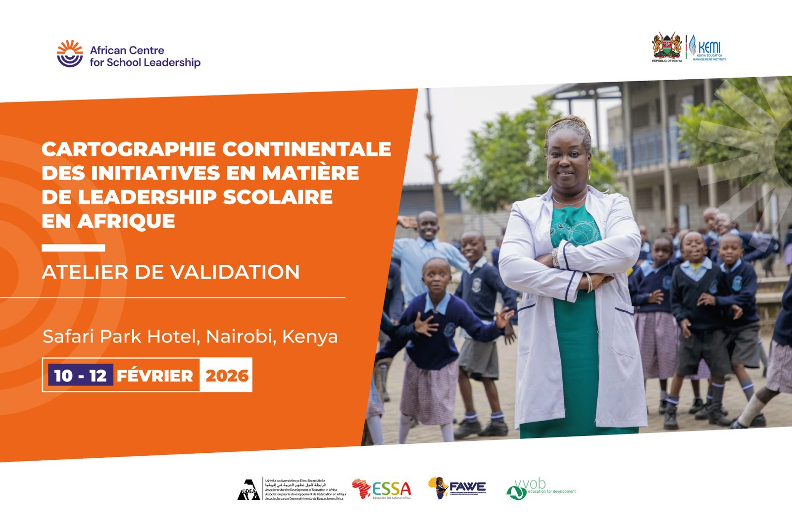 Le Centre africain pour le leadership scolaire (ACSL) organise un atelier de validation à Nairobi, au Kenya, du 10 au 13 février 2026, qui réunira les parties prenantes du leadership scolaire, notamment les décideurs politiques, les prestataires de développement professionnel, les chercheurs, les chefs d'établissement et les responsables de l'éducation. L'atelier servira de plateforme pour examiner et affiner les résultats de la cartographie, garantir la pertinence contextuelle et co-créer une feuille de route pour renforcer le leadership scolaire dans les pays africains.